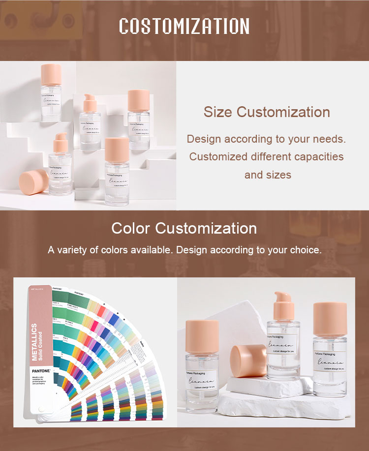 Bottles: The original color of our glass bottles is clear, but they can be customized with any effect, such as matte pink, glossy amber, frosted, gold or silver.